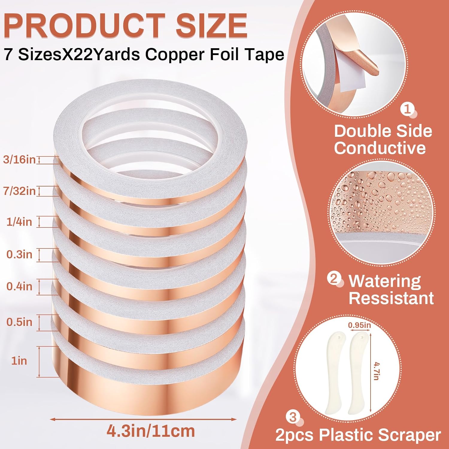 • Multi-Size Conductive Copper Foil Tape: The set contains 7 rolls of genuine copper foil tape, each 22 yards in length. Width options include 3/16″, 7/32″, 1/4″, 0.3″, 0.4″, 0.5″, and 1″. Designed to conduct electricity on both sides, the tape adheres smoothly to uneven surfaces and supports a wide range of DIY and stained glass projects.