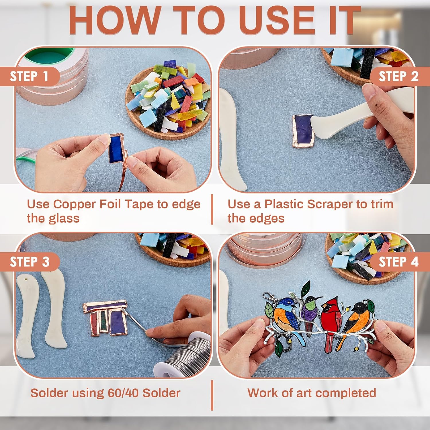 • Practical Tools for Stained Glass Creation: This stained glass tool set supports every stage of the crafting process. Apply the solder wire to outline your design, pair it with appropriately sized copper foil tape, and use the included tools to smooth and refine the final surface for a polished, professional finish.